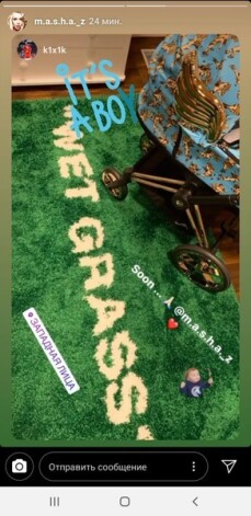 Судя по всему, это интерьер будущей детской — на кадре мы видим зеленый ковер и фрагмент детской игрушки. Этот снимок репостнула к себе и Мария, Instagram которой заполонили кадры беременной фотосессии с любимым мужчиной.
