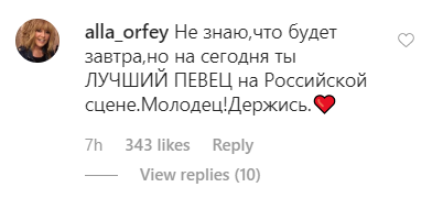 Под фотографией вскоре отметилась Алла Пугачева, которая написала следующее: "Не знаю, что будет завтра, но на сегодня ты лучший певец на российской сцене. Молодец!Держись".