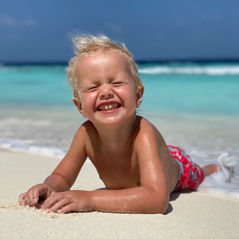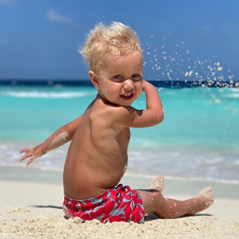 Собчак показала, как малыш отдыхал на пляже. Мальчик задорно улыбался и жмурился от солнца. «Люблю!» — подписала снимки Собчак.