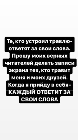 Екатерина признается со слезами на глазах: ее возмущает травля, которую устроили ей ее же подписчики. «Мне очень больно, я удивляюсь, как люди, которые меня не знают, умудряются писать гадости, оскорбления в мой адрес и в адрес моей семьи. Мне нужно быть сильной и возвращаться к жизни, потому что у меня двое детей. Мне нужно жить ради них», — заявила Диденко. Она пригрозила людям, которые травят ее и ее друзей. «Каждый ответ на свои слова», - написала блогер.