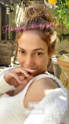 Супруга Канье Уэста решила отдохнуть от светских выходов в компании певицы. Ким опубликовала фото, на котором Дженнифер запечатлена в уютной одежде: мягкий белый топ и накидка из коллекции Skims — бренда, основанного Кардашьян.