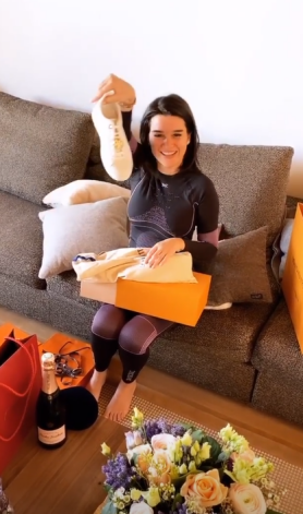 Помимо часов Бородиной подарили несколько пар обуви от известных брендов и сумку. Похоже, что гости угадали с покупками — ведущая осталась всем очень довольна.