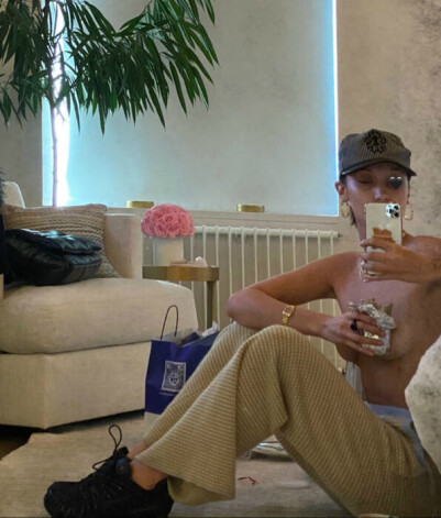 Младшая сестра Джиджи Хадид поделилась селфи, на котором она запечатлена топлес. Звезда позировала сидя прямо на полу в одних брюках и кроссовках.