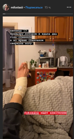 Стася Милославская, возлюбленная Александра Петрова, накануне получила травму во время спектакля. Как рассказала актриса, она подвернула ногу на выступлении.