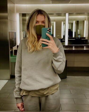 Снимком певица поделилась в своем Instagram-аккаунте. На фото Вера Брежнева предстала с распущенными волосами, без макияжа и в удобном для полета в самолете look'е, состоящем из худи oversize, спортивных брюк и футболки. Образ дополнила медицинская маска цвета хаки — главный модный маст-хэв сезона.
