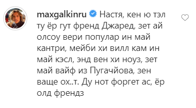 Галкин оказался одним из тех, кто решил посмеяться над своей хорошей знакомой. «Настя, кен ю тэл ту ер гут френд Джаред, зет ай олсоу вери популар ин май кантри», — сказал, в частности, Максим.