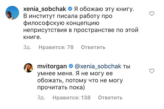 "Я обожаю эту книгу. В институте писала работу про философскую концепцию неприсутствия в пространстве по этой книге",— написала она. На что Максим ей ответил, что она умнее его.