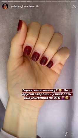 К несчастью для звездных дам, салоны красоты закрылись в связи с эпидемией коронавируса. Юлианна Караулова, Анна Хилькевич, Наталья Рудова показали в Stories отросший гель-лак, а Мария Миногарова — предательски облупившееся покрытие.