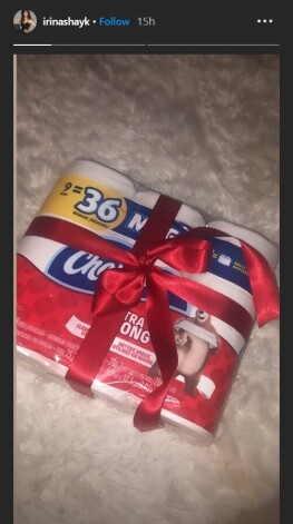 Шейк также сфотографировала забавный сюрприз от тайного поклонника. Ухажер преподнес Ирине большую упаковку туалетной бумаги, украшенную ленточкой. Звезда оценила практичный подарок и похвасталась перед своими фолловерами.