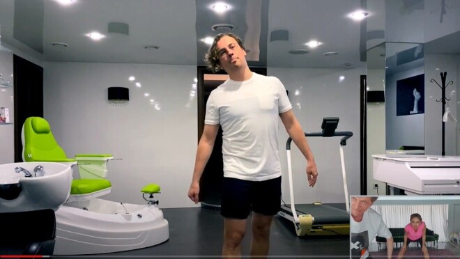Максим занимался с Ляйсан и Павлом, находясь в помещении, которое одновременно представляет собой и спортивный зал, и салон красоты. Здесь же расположился белый рояль.