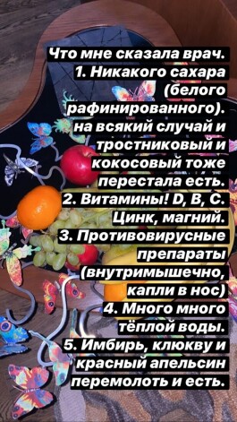 Мария поделилась рекомендациями, которые получила от врача. Как оказалось, ей пришлось полностью исключить сахар из своего рациона. Она пьет много воды, принимает противовирусные препараты и закапывает капли в нос.