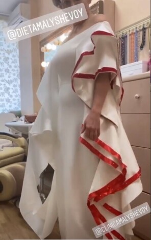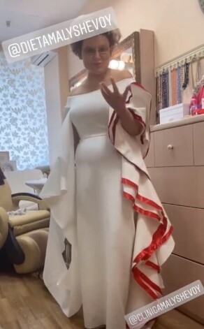 Накануне звезда Первого канала показала белое платье, ради которого она и держит себя в ежовых рукавицах. Наряд белый, а этот цвет, как известно, зрительно «увеличивает» в объёмах. Так что Малышевой надо очень постараться, чтобы выглядеть в нём эффектно. Пока что платье подчеркивает видимые недостатки фигуры Елены Васильевны.