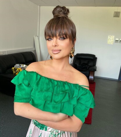 Артистка позировала в ярко-зеленой блузе с оборками и со спущенными рукавами, а также в длинной плиссированной юбке с растительным узором. Черная подводка подчеркнула голубые глаза звезды, а нюдовый блеск – её пухлые губы. Завершающим штрихом стали массивные золотые серьги.