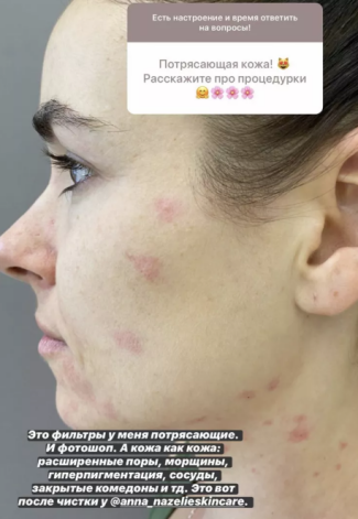 Телеведущая не стала обманывать фолловеров и рассказала, что у нее тоже есть проблемы, прикрепив фото без макияжа и фильтров, сделанное после чистки лица у косметолога. А главным секретом красивой кожи, как оказалось, была грамотная обработка снимков. «Это фильтры у меня потрясающие. И фотошоп. А кожа как кожа: расширенные поры, морщины, гиперпигментация, сосуды, закрытые комедоны и т. д.» — написала Понарошку.