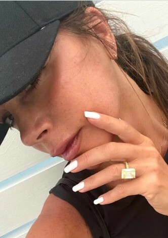 Бекхэм прикоснулась левой рукой к лицу, демонстрируя аккуратный маникюр с белым лаком. На безымянном пальце многодетной мамы было роскошное платиновое кольцо. Оно инкрустировано огромным желтым бриллиантом. Стоимость такого аксессуара оценивается в 120 тысяч фунтов стерлингов. Но Виктория сделала акцент не на нем. «Белые ногти для лета», - скромно подписала фото жена спортсмена.