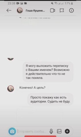 А во втором ролике, выложенном позднее, девушка раскрыла имя собеседника. Им оказался Гоша Куценко. На мелькающих скриншотах переписки видно слова артиста о том, что он предлагает ей исключительно неромантическую встречу. К тому же Алина и сама говорит, что после выкладки первого видео Куценко снова связался с ней и уточнил, что не намекал на интимную связь. В конце ролика девушка показала скриншот с разрешением на публикацию переписки.