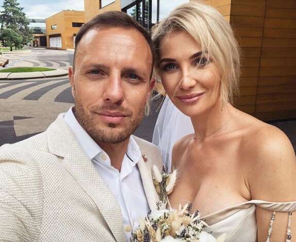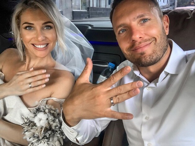 Жених выбрал классический костюм для церемонии. Он предпочел светлый пиджак, белую рубашку и бежевые брюки, а невеста выбрала лаконичное белое платье, которое оставило ее плечи обнаженными. Свадебный образ Анны дополнила красивая фата. "Муж и жена", - кратко пояснил Соловьев.