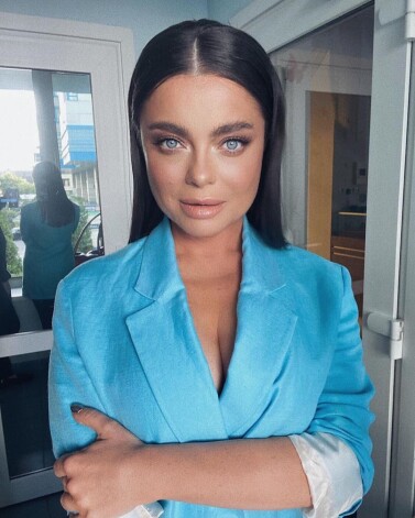 Звезда опубликовала фото, на котором позирует в голубом жакете с гладкой прической и модным нюдовым макияжем, акцент в котором сделан на пышные растрепанные брови.