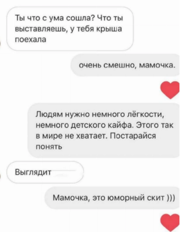Эти посты сильно разозлили Любовь Успенскую. «Ты что, с ума сошла? Что ты выставляешь, у тебя крыша поехала?» — написала она дочери. Та, в свою очередь, объяснила родительнице, что это такой юмор. Но, видимо, не сильно смогла убедить в этом звезду. Успенская заметила, что снимки выглядят плохо, используя ненормативную лексику.