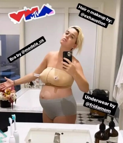 В своих Instagram Stories 35-летняя певица поделилась фото спустя 4 дня после родов. На Кэти были трусы-шорты и бра для откачивания грудного молока с торчащими трубками.