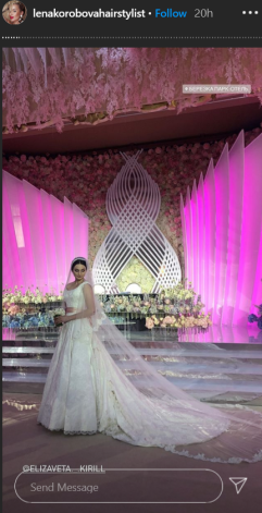 Невеста отправилась под венец в стильном костюме. На ней был белый топ и длинная пышная юбка. Елизавета примерила фату на гладко собранные волосы. Девушка улыбалась и выглядела счастливой. Она позировала в шикарном зале, декорированном в розовом и белом оттенках.