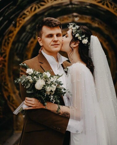 19-летняя невеста выбрала для торжества легкое струящееся платье со шлейфом, которое дополнила изящным венком, жених по традиции отдал предпочтение темному классическому костюму.