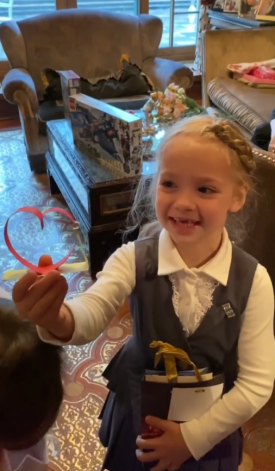 Потом в зал вышла Лиза: "С днем рождения, Лизочка", - тут же подловил ее Гарри, зачитал поздравительное стихотворение, а потом подарил подарок: открытку и бальзам для губ. И это еще не все! Мальчик всем членам семьи преподнес сделанных из бумаги улиток, чья раковина получилась в форме сердца.