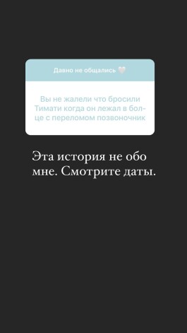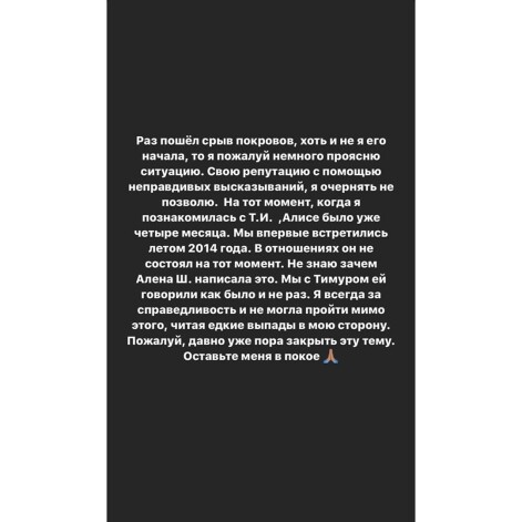 Анастасия эмоционально отреагировала на критику и рассказала, что эти обвинения абсолютно не соответствуют действительности. «Раз пошел такой срыв покровов, хоть и не я его начала, то я, пожалуй, немного проясню. Свою репутацию с помощью неправдивых высказываний я очернять не позволю. На тот момент, когда я познакомилась с Т.И., Алисе было уже четыре месяца. Мы впервые встретились летом 2014 года. В отношениях он не состоял на тот момент. Не знаю, зачем Алена Ш. написала это. Мы с Тимуром говорили ей, как было, и не раз. Я всегда за справедливость и не могла пройти этого, читая едкие выпады в мою сторону», — пояснила Решетова.