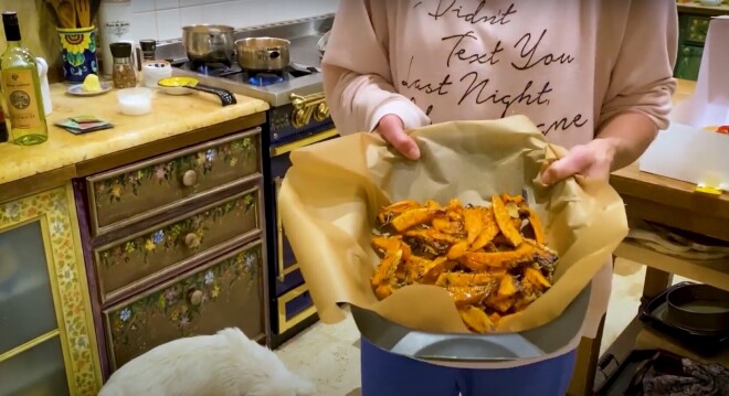 «Вот вы меня все время спрашиваете, куда девается та еда, которую я всегда готовлю… Вот это — единственное, что сегодня удалось спасти, все остальное съели операторы», — сказала актриса и показала противень с картофельными чипсами.