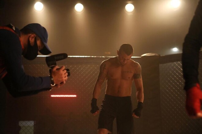 В кадре Павел заснят в восьмиугольнике — специальном ринге ММА. Прилучный устало склонил голову вниз, и позировал в одних только спортивных шортах для боя и в темных бинтах на руках. На снимке хорошо заметны не только многочисленные татуировки актера, но и его прекрасная физическая форма — ради роли Сергея Евдокимова по прозвищу Волчок Прилучный набрал внушительную мышечную массу. Помимо актера, на фотографии также заметен оператор проекта, снимающий сцену с ручной камеры.