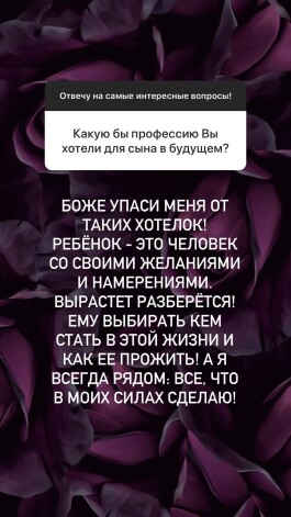 Кроме того, пользователи поинтересовались, в какой бы профессии она хотела, чтобы себя реализовал ее сын Ваган. «Боже упаси от каких-то хотелок. Ребенок – это человек со своими желаниями намерениями. Вырастет сам разберется. Ему выбирать, кем стать в этой жизни и как ее прожить. А я всегда рядом. Все, что в моих силах сделаю», — сказала она.