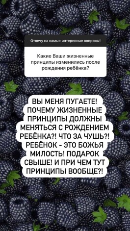 Также Брухунову спросили, какие жизненные принципы изменились у нее после рождения ребенка. «Вы меня пугаете. Почему жизненные принципы должны меняться с рождением ребенка? Что за чушь? Ребенок – это божья милость. Подарок свыше. Причем тут принципы вообще?» — задала она ответный вопрос.