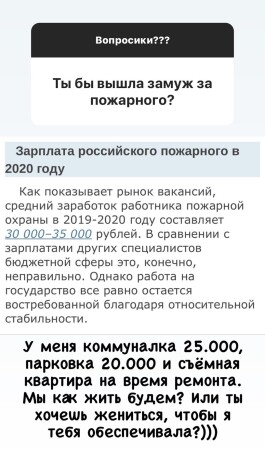 Так, в очередной рубрике «вопрос-ответ» на своей странице в Instagram Настасье предложили выйти замуж за пожарного или следователя. В ответ звезда опубликовала статистику зарплат госслужащих в разных регионах - от 25 тысяч рублей (275 евро).