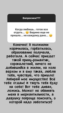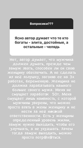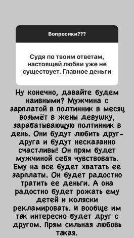 Такой ответ возмутил подписчиков. «Настоящей любви не существует, главное деньги», «Многие в стране корячатся не меньше вашего, но не имеют ваших денег!», - попытались урезонить они актрису. Но это привело к обратному эффекту - оскорблению всех мужчин с зарплатой в 50 тысяч. По мнению звезды, пожарные, следователи и другие работники с низкими зарплатами «ничего не добились», и это их собственный выбор.