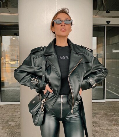 Экс-участница «Дома-2» покружилась перед камерой в черном total look: кожаные легинсы, косуха, водолазка с надписью «Власть» под горлом. Наряд дополнили сумочка (также черная) и темные солнечные очки.