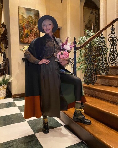 После спектакля артистка наконец отправилась в гости к своей маме и Максиму Галкину. Обрадованный шоумен заснял певицу на лестнице в прихожей особняка. Кристина позировала в костюме своей героини. Под длинную юбку она надела облегающие брюки и комфортные ботинки. Сверху на экс-возлюбленной Владимира Преснякова был длинный кейп.