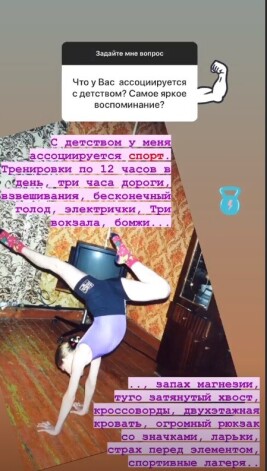 «С детством у меня ассоциируется спорт. Тренировки по 12 часов в день. Три часа дороги, взвешивания, бесконечный голод, электрички, три вокзала, бомжи... Запах магнезии, туго затянутый хвост, кроссворды, двухэтажная кровать, огромный рюкзак со значками, ларьки, страх перед элементом, спортивные лагеря...» - объяснила она и показала фото из семейного архива.