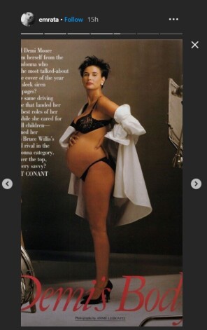 После того, как Ратажковски рассекретила свое положение, она стала активно делиться подробностями. Инстадива обожает раздеваться, а собственное новое тело привело ее в восторг — и теперь она не может остановиться в своем желании запечатлеть это время для истории. На этот раз Эмили решила повторить один из самых известных «беременных» снимков селебрити.