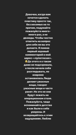 Своим примером она предупредила поклонниц от необдуманных решений. «Девочки, когда вам хочется сделать пластику просто так, без весомых на то причин, подумайте, пожалуйста, много-много раз, а не дважды. Честно-честно ответьте на вопрос, для себя ли вы это делаете», — посоветовала Катя.