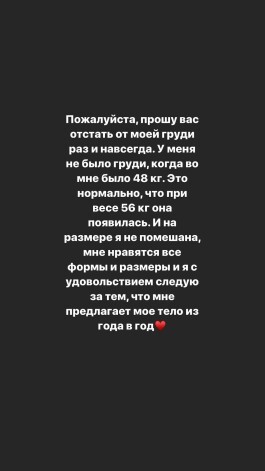 Катя заявила, что ей неприятно излишнее внимание к подросшему бюсту. Тем более что для этого певица не прибегала к услугам пластического хирурга. «Пожалуйста, прошу вас отстать от моей груди раз и навсегда. У меня не было груди, когда во мне было 48 кг. Это нормально, что при весе 56 кг она появилась», — объяснила Кищук.