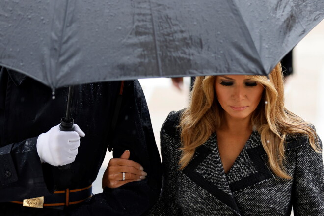 Еще более интересно, что Дональд и Мелания находятся очень далеко друг от друга, а первая леди и вовсе идет под руку с бравым статным солдатом, который держит зонтик и защищает «свою даму» от дождя.