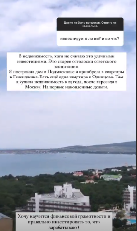 Один из подписчиков поинтересовался, во что инвестирует Водонаева, и она ответила, что в недвижимость. Причем хорошими инвестициями она это не считает. "Это скорее отголоски советского воспитания. Я построила дом в Подмосковье и две квартиры в Геленджике. Есть еще квартира в Одинцово. Там я купила недвижимость в 23 года. После переехала в Москву. На первые накопленные деньги", - сообщила Водонаева.