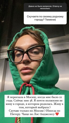 Также Алена призналась, что не скучает по родному городу Тюмени - иногда лишь по Питеру и Лос-Анджелесу.