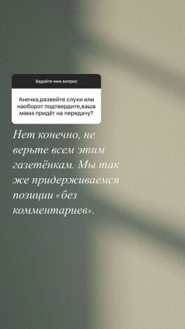 Ранее в Сети появились сообщения СМИ, что Заворотнюк снялась в программе, в которой рассказала о своем состоянии. «Нет конечно, не верьте всем этим газетенкам», - написала Анна. Она добавила, что ее семья придерживается позиции «без комментариев».