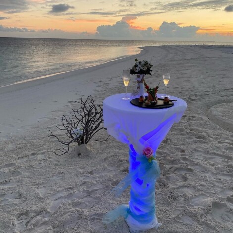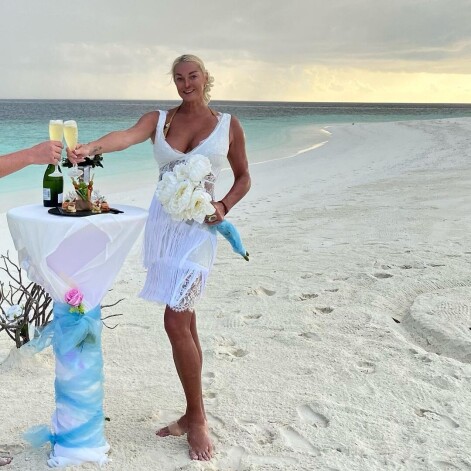 Однако успев загореть и накупаться, Анастасия разместила снимки, которые заинтриговали ее фанатов. Она позировала на побережье в золотом мини-бикини. На бедрах была белоснежная повязка, а в руках она держала букет цветов, повязанный голубыми лентами. Рядом с Волочковой стоял небольшой стол с шампанским и бокалами. Он был украшен в свадебном стиле. «Это чудо! И любовь! И Мальдивы», — написала звезда.