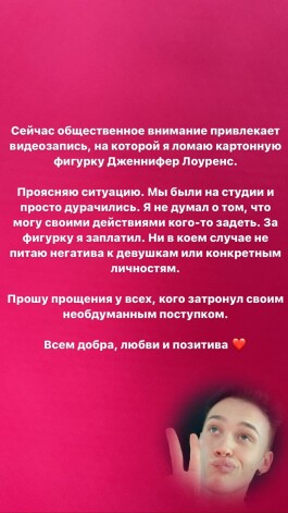 Позже сам Даня Милохин попытался оправдаться за свой поступок. «Проясняю ситуацию. Мы были на студии и просто дурачились. Я не думал о том, что могу своими действиями кого-то задеть. За фигурку я заплатил. Ни в коем случае не питаю негатива к девушкам или конкретным личностям. Прошу прощения у всех, кого затронул своим необдуманным поступком», — отметил молодой артист.