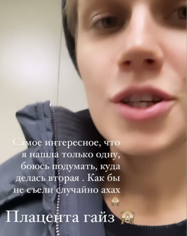 «Плацента, гайз. Самое интересное, что я нашла только одну, боюсь подумать, куда делась вторая. Как бы не съели случайно», — иронично прокомментировала свои действия Мельникова.