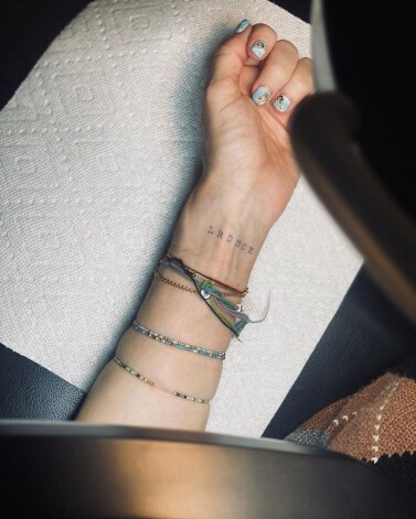 «Подписано в первый раз…» — сообщила нам она под снимком. Мы первым делом, конечно, обратили внимание на ее креативный маникюр и уже после рассмотрели на узком запястье 6 букв.