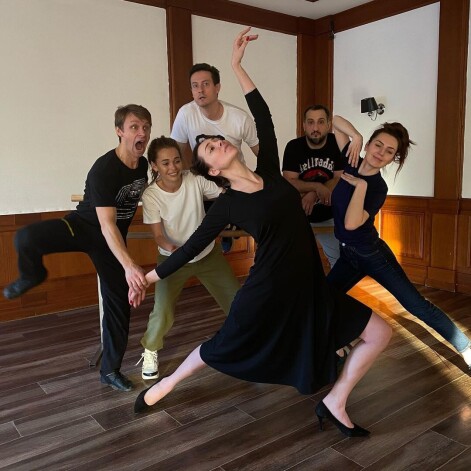 Артисты подурачились перед камерой. Они показали эффектные трюки перед балетным станком. Руководил процессом Арарат Кещян, который заметно поправился и обзавелся благородной сединой. Настасья предстала в расклешенном черном платье и лодочках в тон. Актриса позировала без косметики на лице.