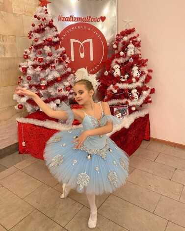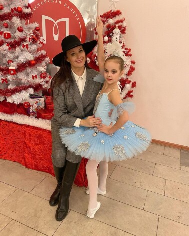 Артистка снялась рядом с дочерью. Елизавета собрала волосы в тугой пучок и сделала яркий сценический макияж с акцентом на глаза. Девочка облачилась в балетную пачку нежно-голубого оттенка с декоративной вышивкой, белые капроновые колготки и чешки в тон. В волосах у нее торчало декоративное страусовое перо.